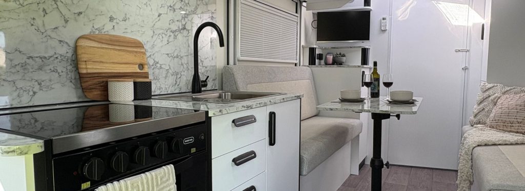 The MY25 Leura offers extensive personalisation with multiple colour schemes for cabinetry, benchtops, upholstery, and external decals. Key optional upgrades include: